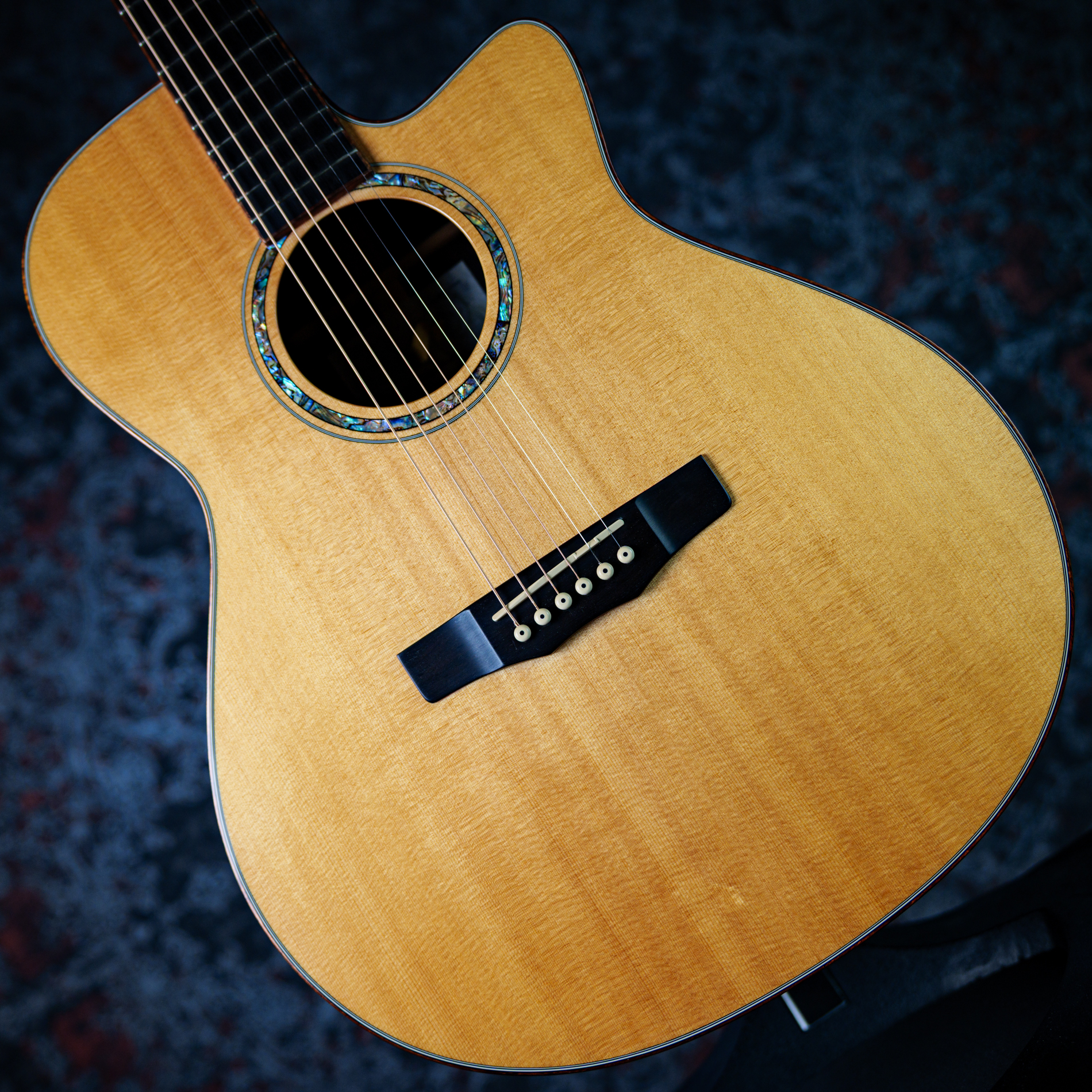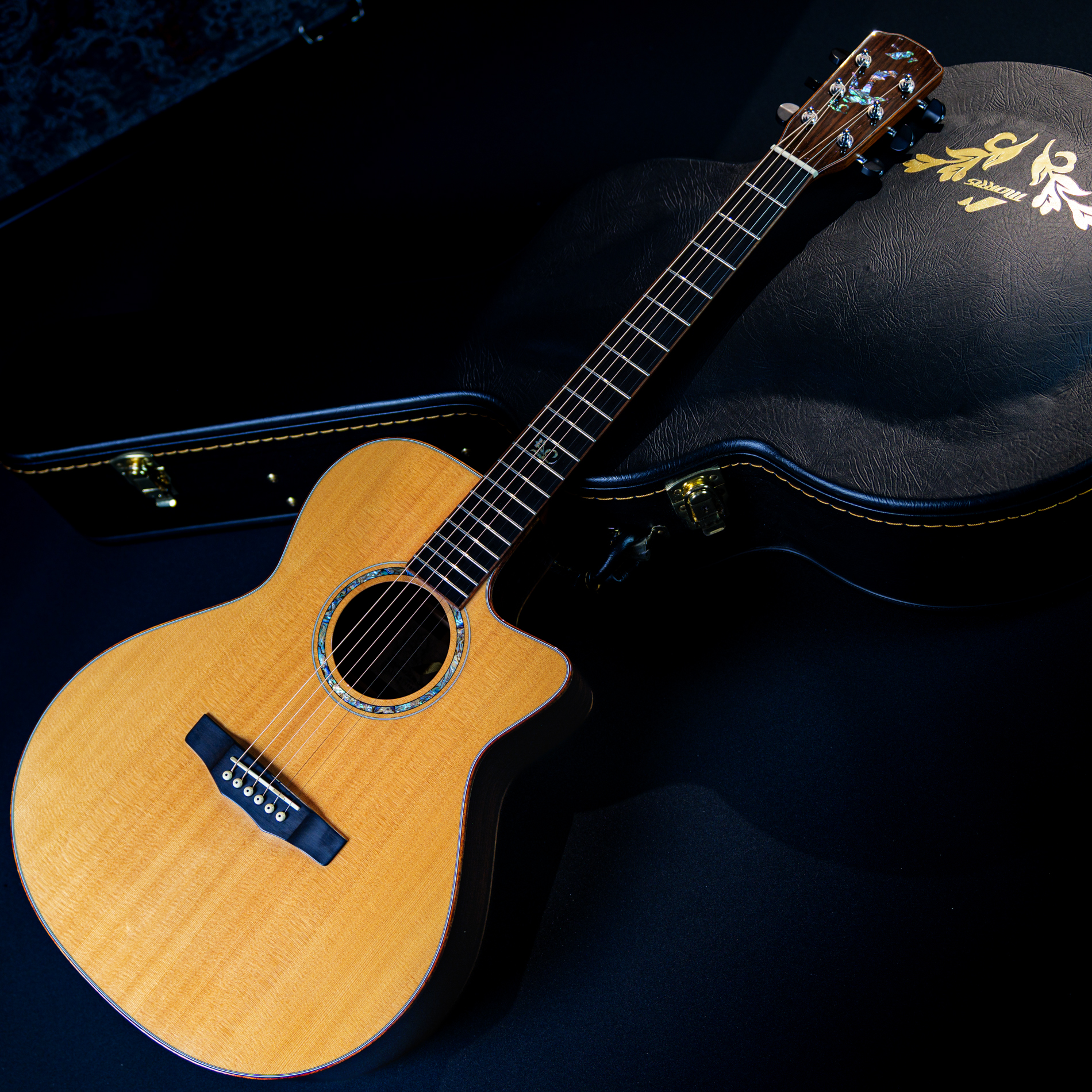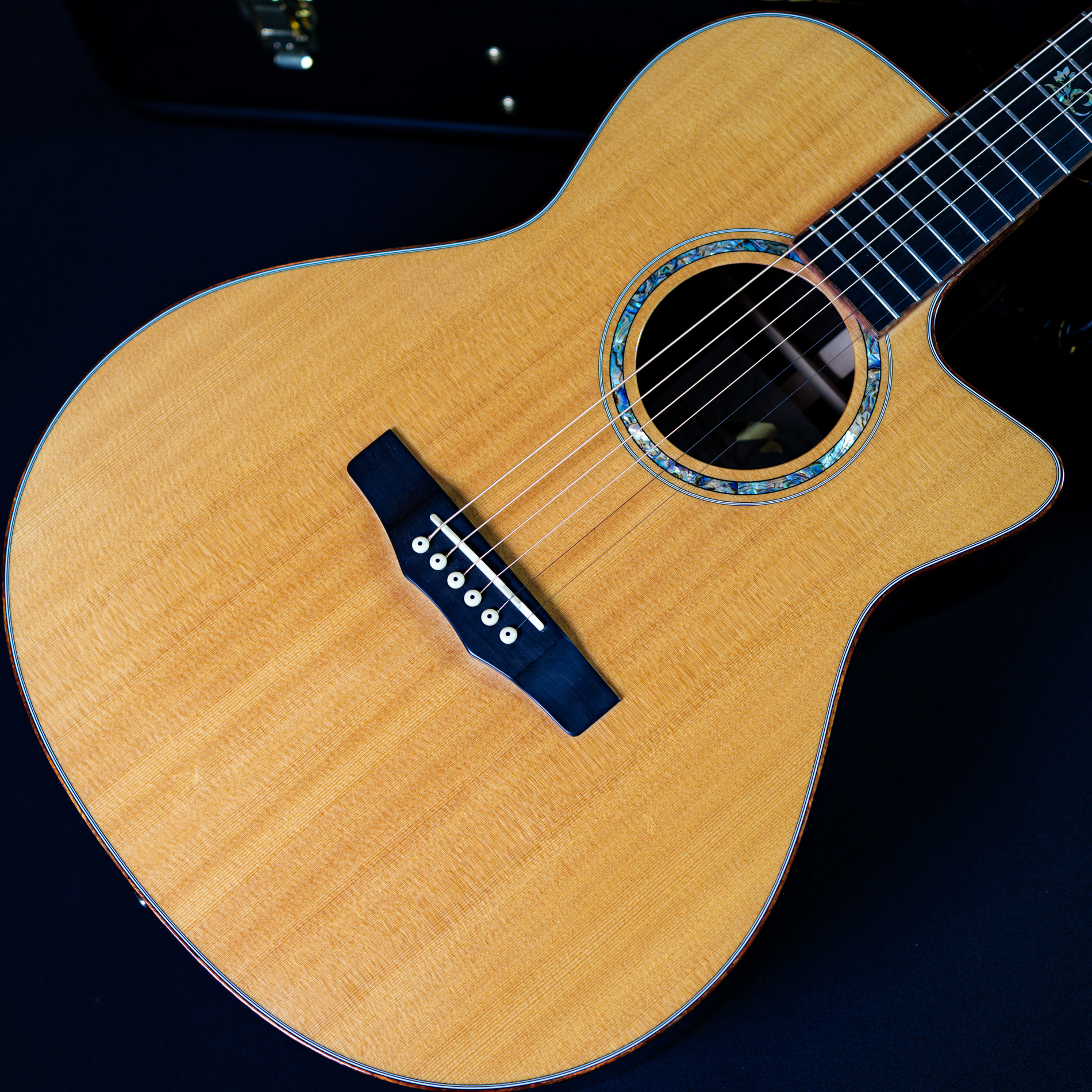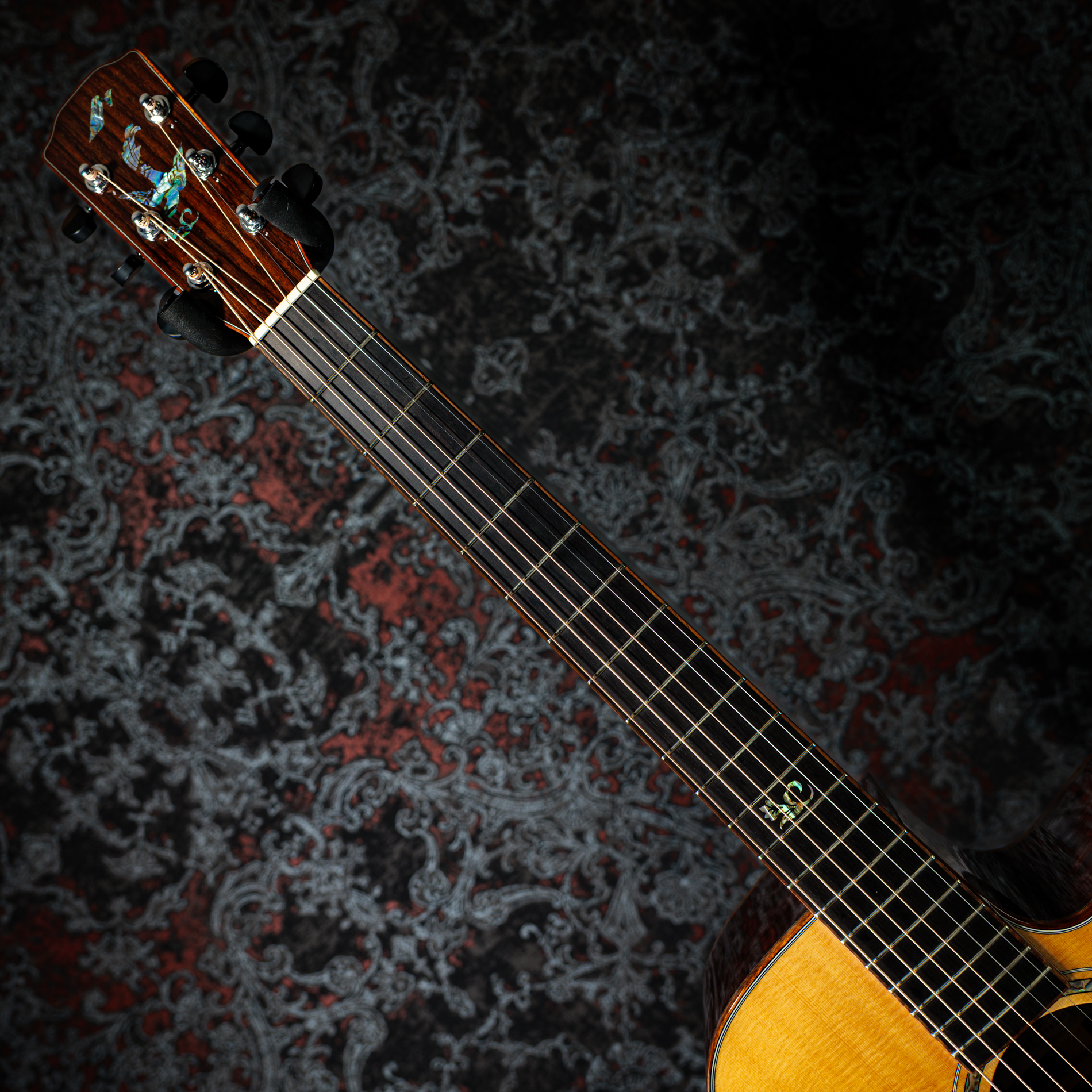 ヘッドロゴと共通のアバロン・シェルによる美しいロゼッタと曲線的なカッタウェイ。