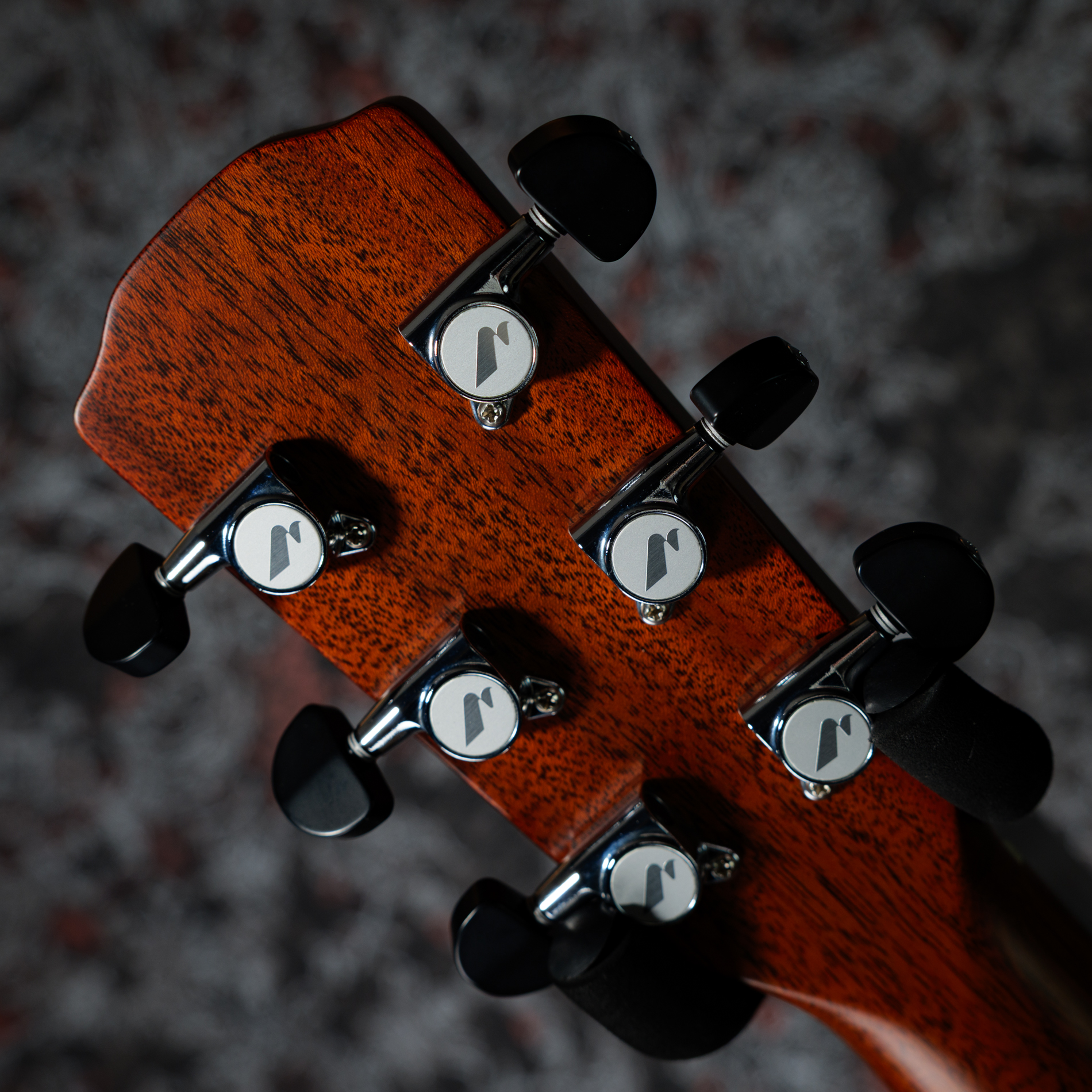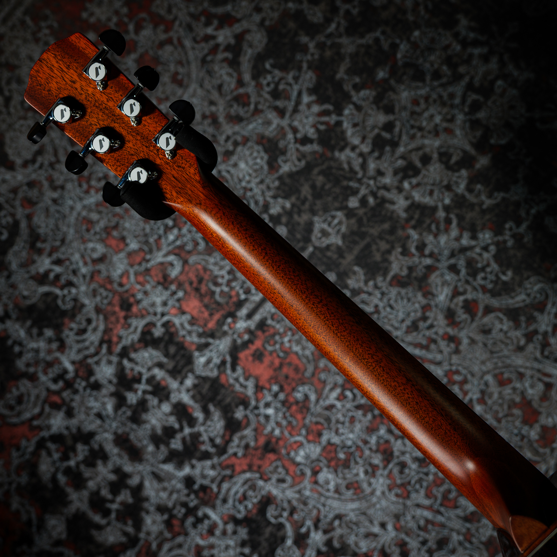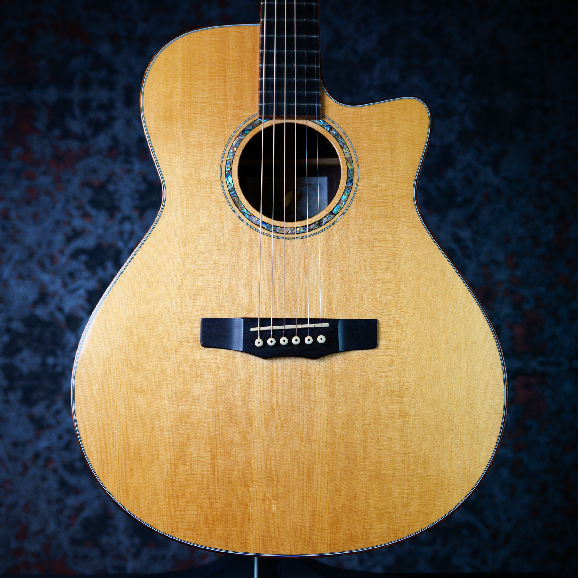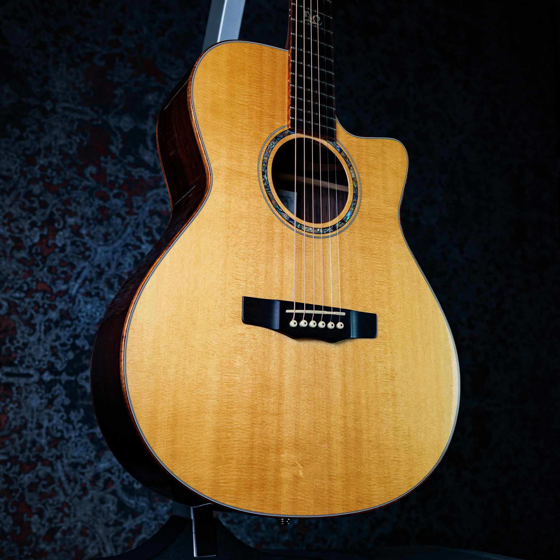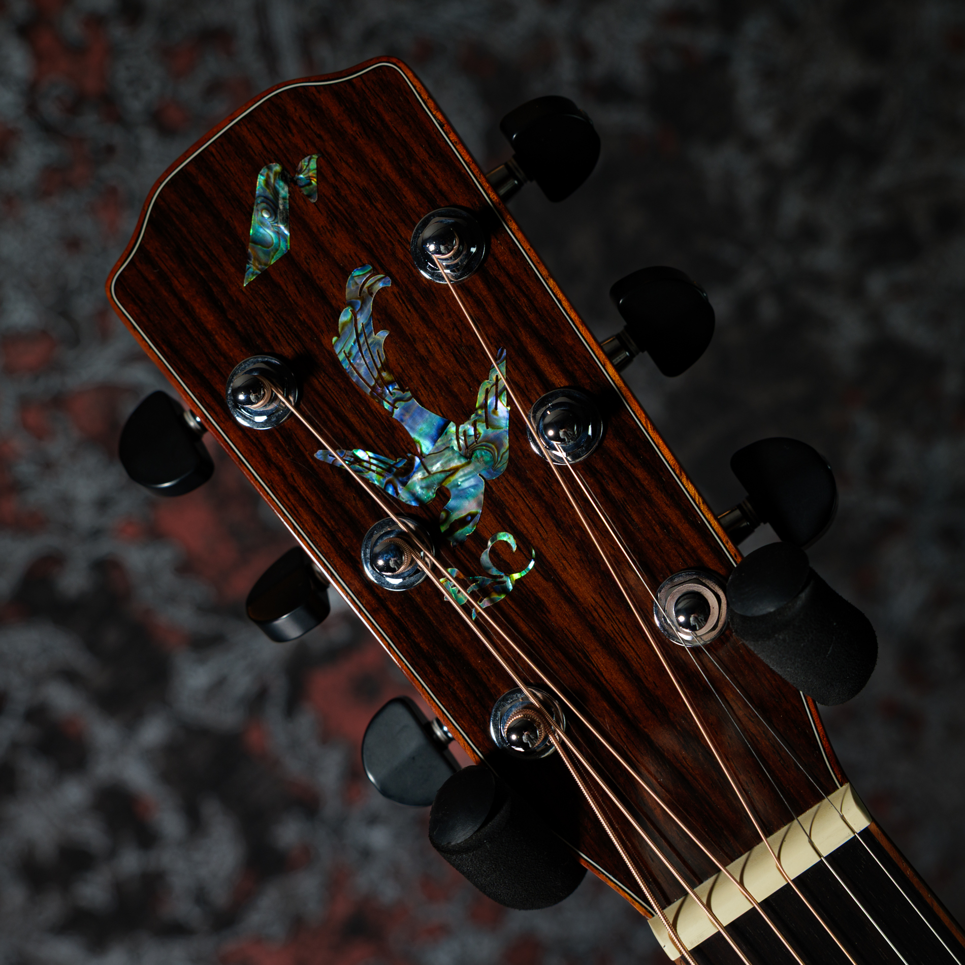 ヘッドロゴと共通のアバロン・シェルによる美しいロゼッタと曲線的なカッタウェイ。