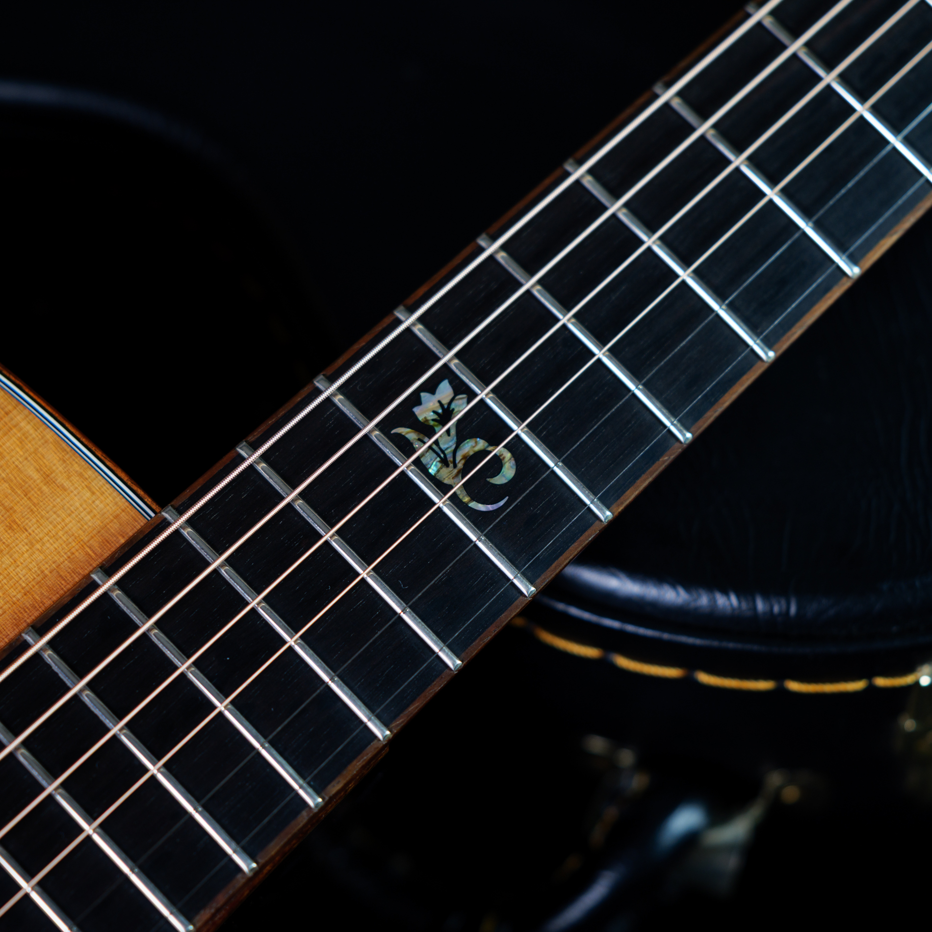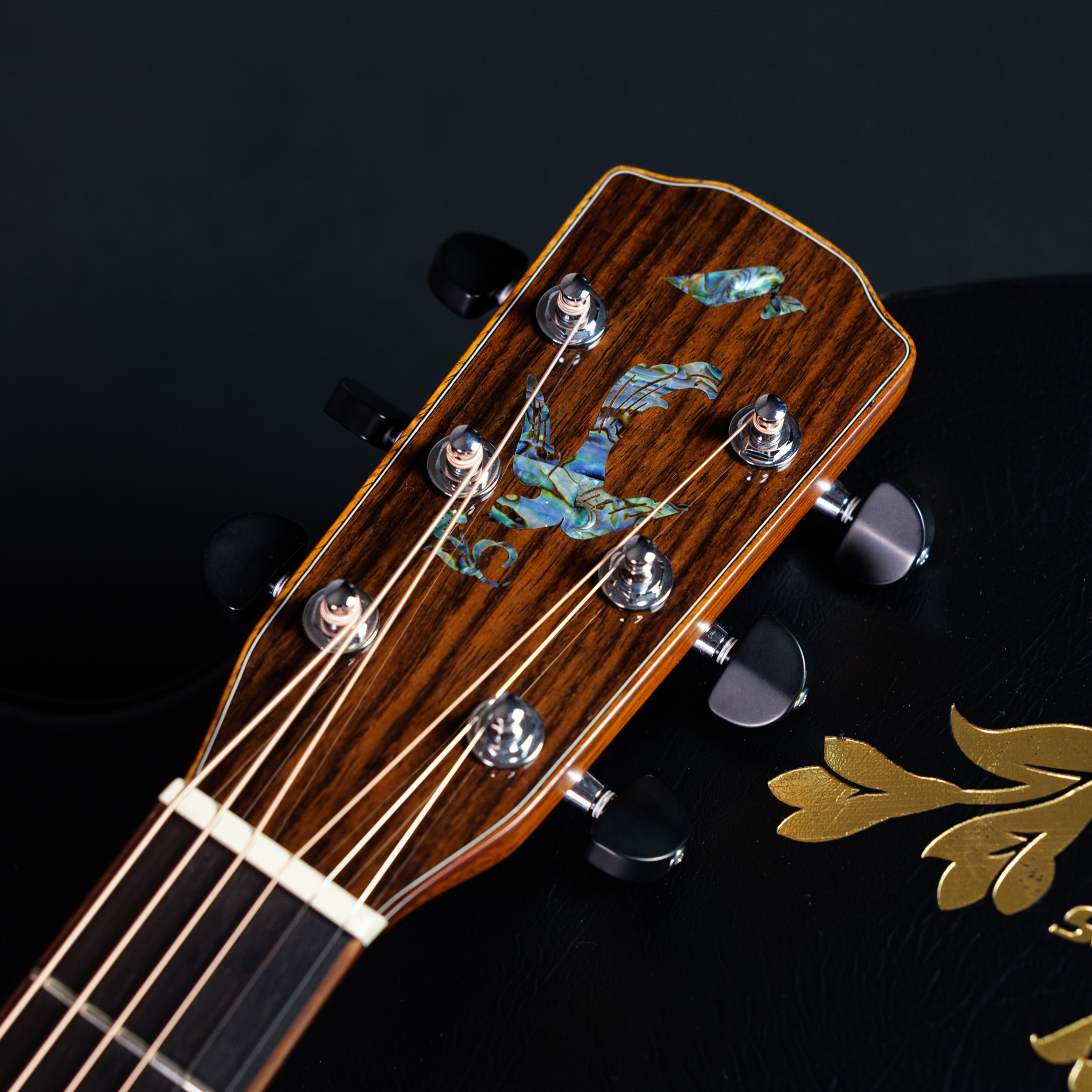 特徴的なアバロン・シェルによるオリジナル・インレイ採用。
